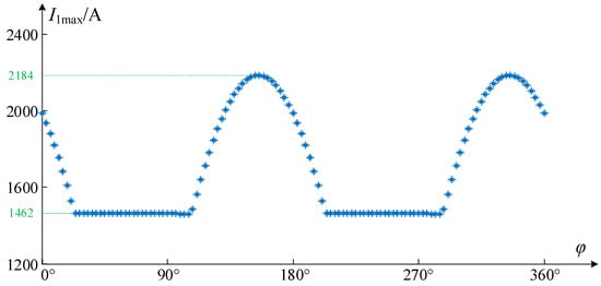 In order to study how the timing of the fault occurrence impacts the maximum value, I1max, of the wind turbine’s output current, Figure 6 shows the curve of the maximum value, I1max, with different grid voltage phases, φ. It can be seen from Figure 6 that as the grid voltage phase, φ, varies from 0 to 2π, the value of I1max varies in the range of 1462 A to 2184 A, which indicates the maximum value of the wind turbine’s output current during the short-circuit fault is between the steady-state current before the fault and the steady-state current after the fault. Therefore, in order to limit the output overcurrent of the wind turbine after the short-circuit fault, the value of the virtual resistance, Rv, can be designed with the goal to ensure that the post-fault output steady-state current does not exceed its pre-fault value.