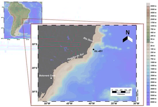 Region studied with the location of the core GL-451, Botuverá cave and the main rivers that contributes to the terrigenous supply, using the software Ocean Data View [20]. Modified from Wang et al. [21], based on Costa et al. [18].