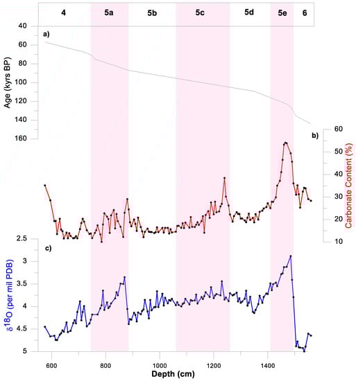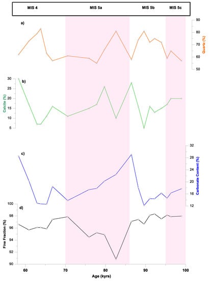 According to this, the variations of the lnTi/Ca and lnFe/Ca in our record are associated with the oscillation between the marine and terrigenous fraction deposited, with the major terrigenous contributions being observed during the MIS 5b and the MIS 4 (Figure 3). However, elementary ratios using Ca must be looked at carefully, because the dilution and dissolution effects can affect directly Ca concentrations [1,7,19].