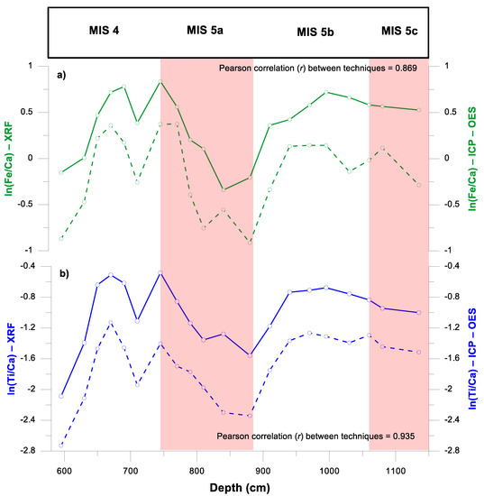 Comparison between the XRF (solid line) and ICP-OES (dashed line) techniques for the (a) ln(Fe/Ca) and (b) ln(Ti/Ca) ratios along the depths of the core. The values of the ratios obtained by XRF are on the left, while ICP-OES on the right. Pearson correlation estimated between the techniques is shown in each a and b Figures.