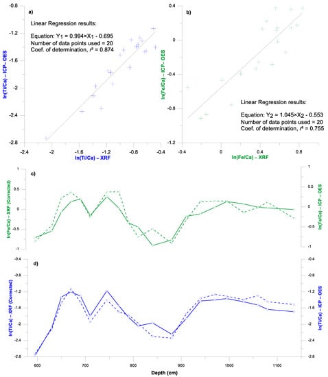On the other hand, the numeric values of the elemental ratios were different when both methods were compared. The XRF measurements always presented higher values than ICP-OES measurements (Table 1), due to a lack of calibration with standard materials in the XRF. Attempting to correct the XRF intensity using the ICP-OES data as a sample with known elementary ratios, a linear regression model was calculated (Figure 4). Both r2 values calculated were considerate high, 0.875 for lnTi/Ca and 0.755 for lnFe/Ca. Based on the linear equation generated (Figure 4a,b), the logarithmic values of the elementary XRF ratios were corrected, considerably decreasing the error in the initially generated concentrations, presenting similar curves between the results using the XRF and the ICP-OES techniques (Figure 4c,d).
