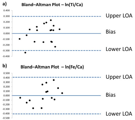 Bland–Altman plot for the (a) ln (Ti/Ca) and (b) ln (Fe/Ca) data. The straight line is the bias (mean of the differences). The dashed lines are for the limits of agreement calculated based on two standard deviations. The mean difference of the techniques for both ratios was close to zero and only one value for ln (Ti/Ca) was out of the LOA, highlighting the similar results between techniques.