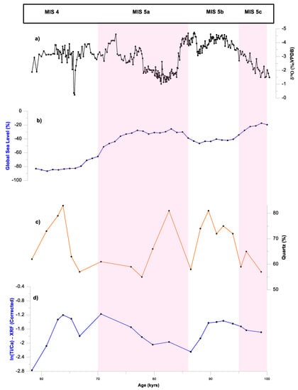 Terrigenous supply proxies compared to precipitation and sea level. (a) Oxygen isotopes ratio (δ18O) in stalagmite BT2 [33] in the Botuverá cave, showing the precipitation pattern in the southeast Brazil, with the lower values in the warmer periods, MIS 5a and 5c. (b) Global sea level stack [34]. (c) Quartz semi-quantitative measures. (d) ln(Ti/Ca) along the period studied.