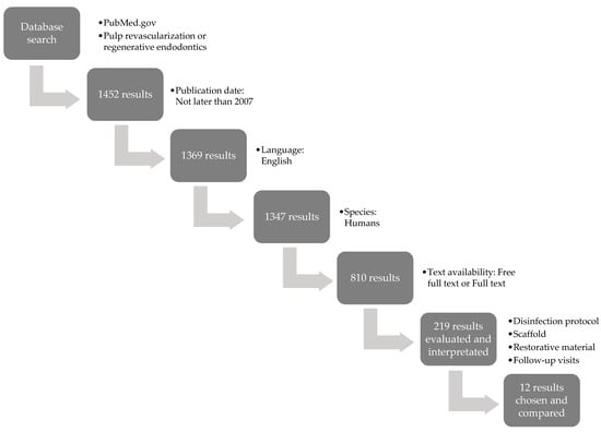 This paper focuses on comparing the REP protocols available in the literature. The selected publications contain a thorough description of different approaches to the root canal disinfection procedure, scaffold type, final tooth restoration material, follow-up appointment frequency, and treatment results. Figure 1 presents a flowchart, which demonstrates the database search strategy used in this paper. We started scoping the available literature in PubMed.gov, using the keywords ‘pulp revascularization’ or ‘regenerative endodontics’. Another filter used was the year of publication—we selected papers written after 2007; then, the search was narrowed to the literature published in English, describing human species and with text availability: free full text or full text. Subsequently, we selected the papers in which the authors accurately describe the disinfection protocol, scaffold and restorative material as well as follow-up visit schemes. However, all of the selected papers describe successful cases. Unfortunately, very few reports on REP failures are available in the literature; thus, the correct choice of the REP protocol and the profound interpretation of its results are significantly hindered. Therefore, the authors of this paper also propose an original REP protocol based on the available literature.