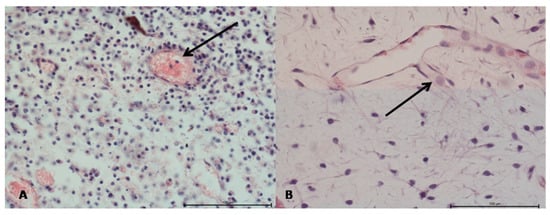 Human molar tooth. (A) Inflammation of the tooth pulp. Blood-filled blood vessels are visible (arrow), surrounded by a moderate macrophage–lymphocytic infiltrate. (B) Angiogenesis (arrow) in human dental pulp (H&E stain enl. 400×).