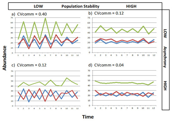 If this pattern is applicable to other systems, this would suggest that the emergent property of the community is the interactions among species (asynchrony), rather than the number of species present. This in turn infers a deterministic formation of community assemblages, rather than random stochasticity [99,100,101]. Hence, although individual populations may fluctuate, competition and niche differentiation allow species to fluctuate in complementary ways, maintaining certain characteristics of stability. From a generalist predator’s point of view (or an anthropocentric view of ecosystem services), resource availability remains stable as the decline of one species is compensated by an increase in another. This could also explain the contradictory theories of stability (e.g., [7,88,102,103]; diversity can beget stability [88], even if population stability is negatively correlated to diversity [102] when the community is highly asynchronous.