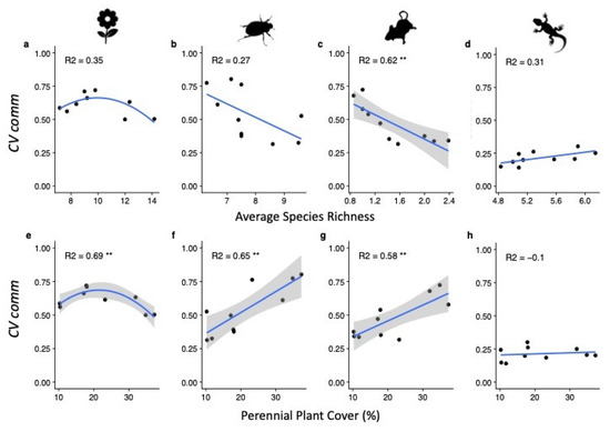 Regressions of (a–d) average species richness and (e–h) of perennial plant cover (PPC) against community variability (CVcomm) for each taxon. Standard error ranges are shown for all significant regressions. Regression lines were plotted using a linear model smoothing function. NB: an increase in CVcomm equates to a reduction in community stability. Explained variation (R2) can only be compared across parameters within each taxon. ** p < 0.01.