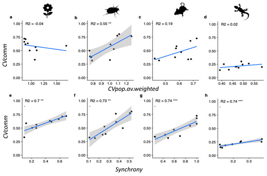 Plots of the regressions of CVpop_av.weighted and synchrony against community variability are given in Figure 3. As can be seen above, only beetles had a positive relationship between Cvpop_av.weighted and CVcomm (Figure 3b), while all four taxa had a significant positive relationship between synchrony and CVcomm (Figure 3e–h).