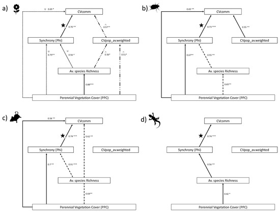All taxa displayed different relationships and directionality among parameters, except for the relationship between synchrony and CVcomm. The key finding in our study was that despite the differences in strengths and directions of relationships between other parameters, the strongest positive relationship for all four taxa was consistently between synchrony and CVcomm (as shown by the highest adj.R2 for a positive correlation in a given taxon as depicted by the star ★ in Figure 4a–d, and see Figure 3e–h). In other words, a high degree of asynchrony was associated with the highest levels of community stability.