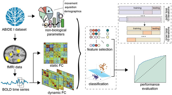 Towards enhancing ASD identification, artificial intelligence techniques have become a well-established tool for the development and application of decision support systems as diagnostic aid [14,15]. In this direction, the majority of recent studies employ the Autism Brain Imaging Data Exchange (ABIDE) dataset (or parts of it), which provides multiple brain parcellation schemes of 17 clinics in the USA, including 1112 individuals in total, along with a variety of machine learning methods, brain atlases, and pre-processing pipelines [16]. For instance, Plitt et al. combined whole-brain FC and behavioral features on 90 individuals from three sites of the ABIDE I dataset and achieved a classification accuracy of 73.89% using an L2-regularized logistic regression and a stratified 10-fold validation scheme [17]. In a similar manner, Chen et al. reached 66% accuracy by utilizing a custom brain parcellation precedure on 20% of the initial ABIDE I dataset (based on age and head motion criteria) paired with whole-brain FC and a support vector machine (SVM) classifier [18]. More recently, Wang et al. used approximately 50% of the ABIDE I dataset to calculate FC among 35 ROIs and attained SVM accuracy of 90.6% [19]. In ABIDE I subset analogous studies, age-matched data and the Craddock brain parcellation atlas combined with convolutional neural networks deep learning methods presented 72.73% [20] and 70.22% [21] classification performance.