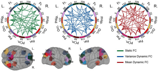 The discriminative features selected by the FS procedure corresponding to sFC (green), variance dFC (blue), and mean value dFC (red). In the lower part of the figure, the DMN areas are highlighted and denoted based on the CC200 brain atlas region codes; color-coded information of the DMN areas is presented with reference to the ribbon colors in the upper part of the figure.