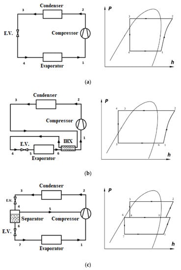 Schematic and P-h diagrams of refrigeration systems: (a) SS, (b) IHX, and (c) ECO.
