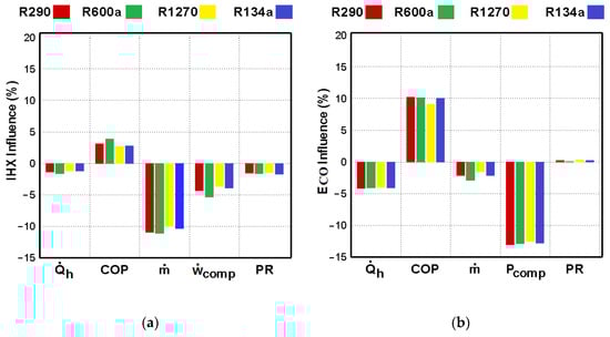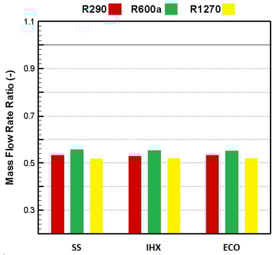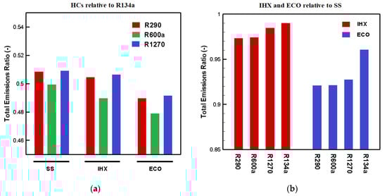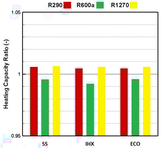 The relative heating capacities of the refrigeration systems with different configurations and refrigerants are presented in Figure 5. The latent heat of condensation and the mass flow rate affect the heating capacity [29]. R1270 and R290 had higher heating capacities than R134a, as they had a much greater latent heat of condensation, but R600a had a lower heating capacity than R134a. Although R134a had a lower latent heat of condensation than R600a, this could be compensated with the much higher mass flow rate of R134a than that of R600a. Hence, the heating capacity of R134a was found to be higher than R600a. As it is not desired to obtain lower heating capacity in many applications using a low GWP alternative refrigerant to HFCs, this problem could be solved by appropriating the equipment, e.g., the compressor.