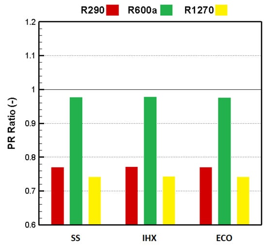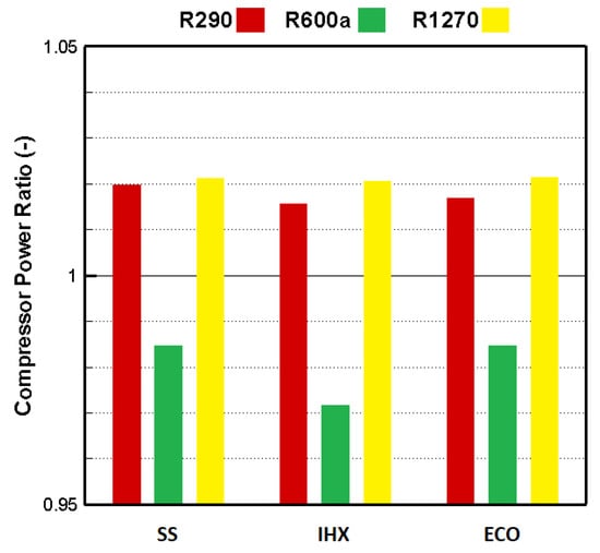 Figure 3 and Figure 4 represent the relative compressor power consumption and compression pressure ratios, respectively. The compressor’s power consumption when using R1270 and R290 was higher than that when using R134a by approximately 1.5% to 2%, whereas it was lower when using R600a as an alternative refrigerant. According to the results, all hydrocarbons had a lower pressure ratio than R134a.