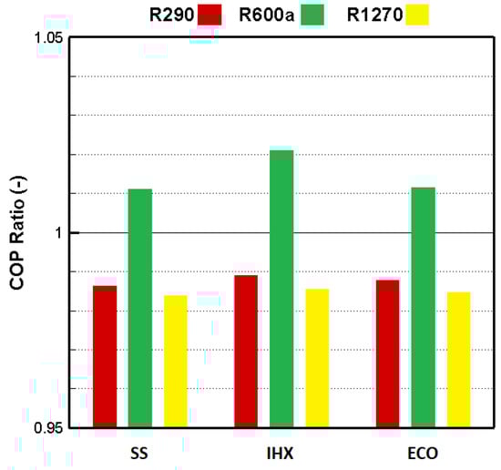 Figure 6 shows the relative coefficients of performance of the systems with different configurations and refrigerants. According to the results, the heating COP of the system when operating with R600a was higher than that using other refrigerants. This can be explained by its lower power consumption compared with other refrigerants, although it had the lowest heating capacity. The increase in power consumption was greater than the increase in heating capacity when the cooling capacity was kept constant. The heating COP of the system when using R290 and R1270 was lower than that using the baseline refrigerant.