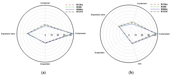 where and are the entropy at the inlet and outlet of the expansion valve in different configurations, and is the refrigerant mass flow rate passing each expansion valve. The exergy destruction of the internal heat exchanger in the second configuration (IHX) was calculated as shown in Equation (19) [27].
