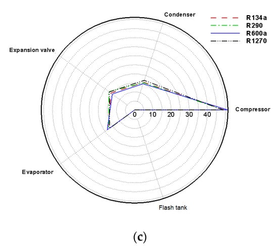 The relative irreversibility of each component of the refrigeration system with different configurations and refrigerants is presented in Figure 8. The results revealed that the compressor was associated with 42% to 45% of the total system irreversibility in the SS cycle, followed by the expansion valve, which was associated with 26% to 29% irreversibility with different refrigerants. In the IHX cycle, the compressor had 42% to 45% of the total system irreversibility, similar to the SS cycle, followed by the condenser and expansion valve, with about 16% to 19% of the total irreversibility. In the third cycle with flash tank vapor injection, the compressor was associated with approximately 50% of the total system irreversibility, while the flash tank had a negligible RI value.