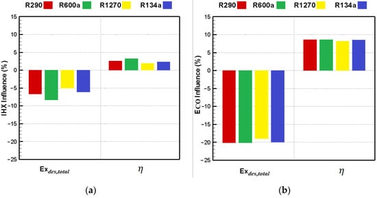 The influence of utilizing the IHX and vapor injection on exergy parameters is shown in Figure 9. It was revealed that the utilization of the vapor injection improved the exergy efficiency of the system by approximately 8% compared with the single-stage cycle. In comparison, the IHX could improve the exergy efficiency by between 2% and 3%. The utilization of vapor injection improved the system’s performance remarkably, irrespective of the refrigerant type, while the improvement by the IHX depended on the type of the refrigerants. Therefore, these results agree with the COP results regarding vapor injection and the IHX presented in Figure 7.