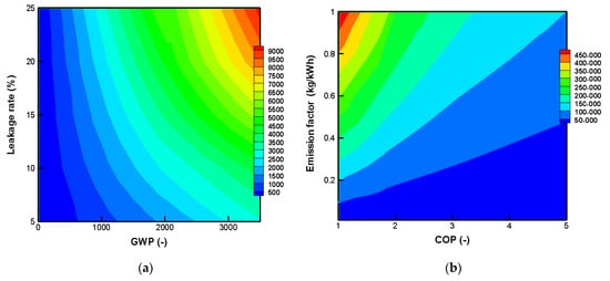 where L, n, m, , , and are the leakage rate (kg per year), the system’s lifetime (year), the optimal refrigerant charge (kg), the recovery factor at the end of life, annual energy consumption (kWh per year), and the carbon emission factor (kgCO2-eq kWh−1) related to electricity generation, respectively.