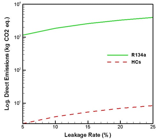 Logarithmic direct CO2-eq emissions of hydrocarbons and R134a at different leakage rates.