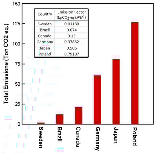 Emissions from electricity consumption depend on the sources of energy used for electricity generation, and they differ from country to country. If a country has low carbon electricity generation, the total equivalent emissions are relatively low. Hence, to investigate the emissions of a refrigeration system, it is imperative to consider the CO2-eq emission factor as a determinant criterion. Figure 13 shows the total emission of the refrigeration system when operating with R290 in different countries. According to the results, in a country such as Sweden, where the main electricity generation sources are renewable clean energy, the total emissions are much lower than in other countries. These results support the statement that in addition to the phase-down of high GWP refrigerants, countries must move toward clean energy sources for electricity generation to minimize the carbon footprint of refrigeration systems.