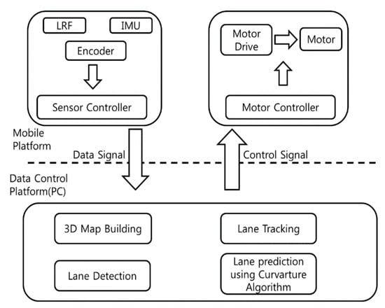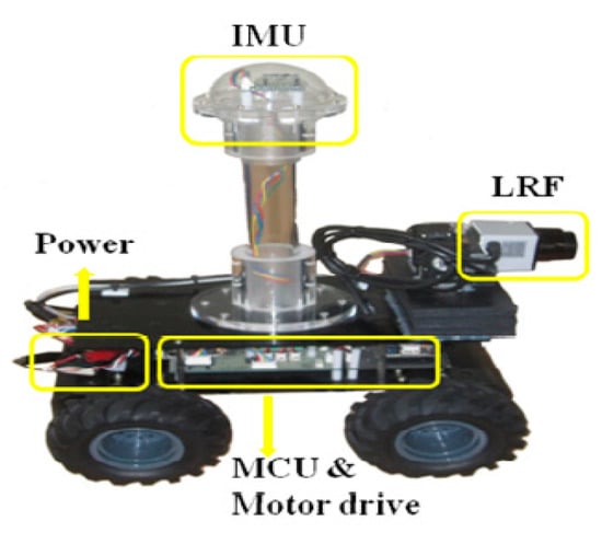 The sensor unit of the mobile platform is composed of the LRF, inertial measurement unit (IMU), and encoder as well as the sensor controller. Sensors measure the information necessary for building road maps and controlling the robot, and the data controller receives the data values obtained by the sensors and ensures a stable transfer to the data control platform. LRF is used for obtaining the road information by scanning the road using a laser. The IMU sensor is used for obtaining information on the position and direction of the robot. The encoder is used for measuring the rotational values of the mobile robot’s motor and obtaining the information on distance covered and relative coordinates by means of dead reckoning. The motor control unit of the mobile platform is composed of the motor drive, motor, and motor controller. The motor controller interprets the control signals received from the data control platform in order for the mobile robot to navigate stably and the motor drive for moving the mobile robot according to the instructions from the motor controller. The data control platform consists of a personal computer (PC)-based program and executes functions such as creation of 3D road maps with the data transferred from the mobile platform sensor unit, extraction of lane feature points, prediction of lanes, and generation of control signals. Further, it transfers the generated control signals to the mobile platform motor control unit for the mobile robot to navigate stably along the lane. Figure 2 shows the structure of the robot built for this study. The LRF on the right-hand side is a sensor used for obtaining road information. The sensors produced by Hokuyo Ltd. and Sick AG are mostly widely used, and the URG-04LX of the Hokuyo Ltd. used in this study has a relatively narrow measurement range compared to the sensor by Sick AG, but its minimum measurement distance is very close and its resolution makes it suitable for building 3D maps and scanning lanes.