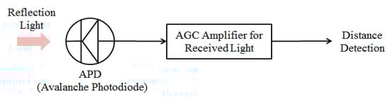 Figure 3 shows a schematic representation of the laser signal processing steps. The returning light reflected off the object is converted into electrical signals at the avalanche photodiode (APD) and amplified with an automatic gain control (AGC) amplifier. In this process, the closer the color of the object is to black, the less is the amount of energy returned, resulting in weak signals as compared to objects having other colors; thus, the signals are amplified at AGC and calculated to be located closer than other objects [29]. When this principle is applied to road scanning, a height difference in the asphalt lane is observed.
