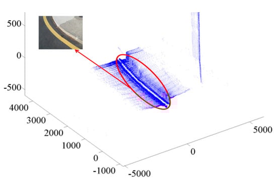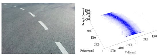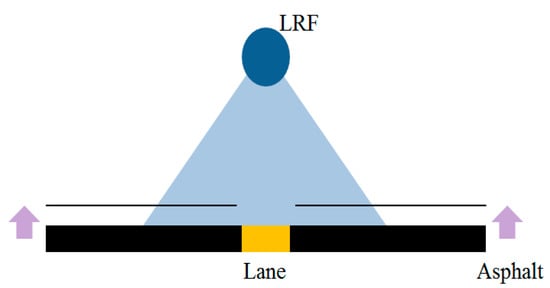 Figure 4 shows the LRF-based road scan principle. As stated above, a black-colored object scanned with LRF is considerably amplified by AGC and the LRF-to-object distance appears to be shorter than it really is, whereas colored objects appear almost identical to their real distances [30,31]. As a result, in a 3D road map built using the LRF data, asphalt seems to be higher than the lane.
