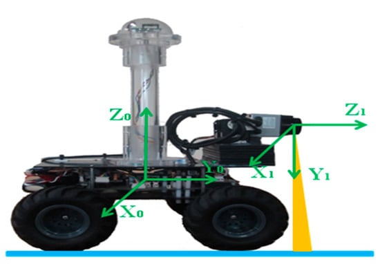 The data coordinated by LRF do match the coordinate axis of the mobile robot. Thus, to overcome this problem, coordinate transformation is necessary to match the standard coordinate axis of the mobile robot. Figure 5 shows the coordinate transformation process in which the LRF 2D scan data undergo transformation to match the coordinate axis of the mobile robot. X0, Y0, and Z0 constitute the standard coordinates used for building maps with the coordinate axis of the mobile robot. X1, Y1, and Z1 are the LRF coordinates. The change in the coordinates of the mobile robot and position entails a change in the LRF’s coordinate axis; in order to build a 3D map using the LRF-measured data, LRF data should be coordinated to match X0, Y0, and Z0. This requires the movement, rotation, and LRF coordinate axis data; further, Equation (3) using the rotation matrix is applied to implement the transformation of the LRF coordinates.