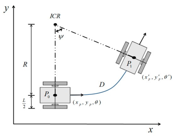 In Figure 8, if the mobile robot moves from point A to point B, let the time at point A be and its location , then the time at point B can be expressed as and its location as . ICR’s coordinates can be defined as in Equation (9).