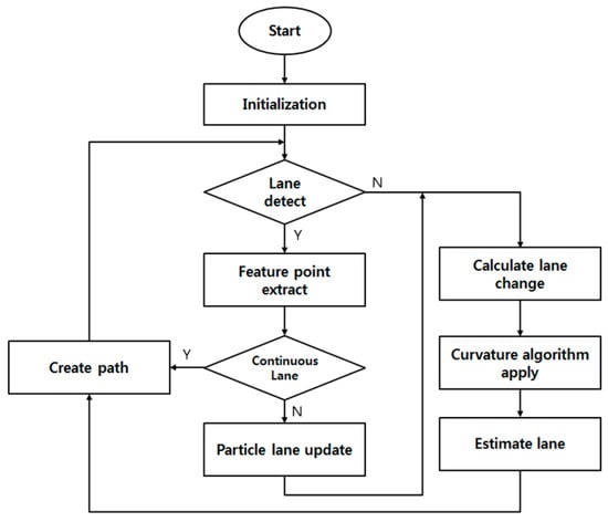 After the initialization, the system scans the road using LRF. Lanes are then sought using the feature point extraction algorithm. When the feature points of the lane are extracted and the lane borders are found, a path is generated via the line coordinates. If no lines are found, the changing line pattern is figured out using the line coordinates available up to that point. Thus, a path is generated using the curvature algorithm as well as the lane change rate. When the line recognized is not a continuous line, but a dashed line, the curvature algorithm is updated with the information on the given line, and a more accurate prediction path can be generated.