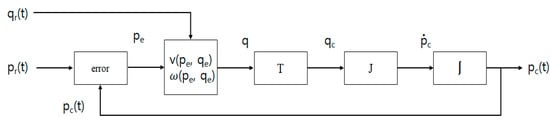 Figure 10 shows the structure of the following controller. represents the target position and represents the current position of the mobile robot. Through the error matrix, which is the difference between the current position and the target position, composed of the required linear velocity and angular velocity is obtained. The third box is converted to fit the hardware considering the structure of the hardware. The coordinates of the mobile robot reflecting the required speed are combined with the Jacobian and changed to the current speed which is accumulated and feedback to the current position.