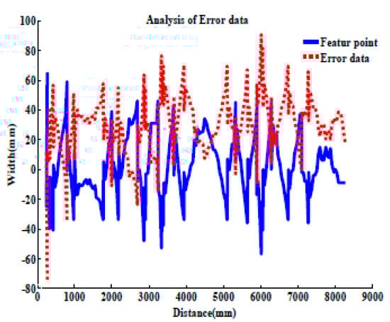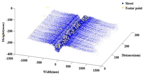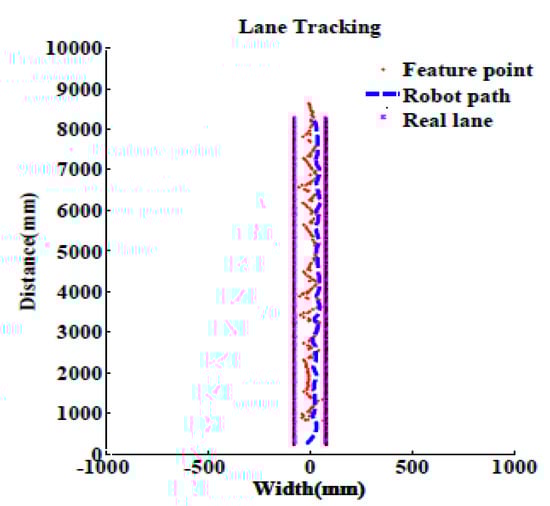 In Figure 12, the lane feature points extracted from the 3D road map shown in Figure 11b by using the feature point extraction algorithm are highlighted with yellow dots. The robot was instructed to navigate along the right-hand-side boundary line. The errors in the case of the real lane width and the case of the scanned lane width with respect to the right-hand-side boundary line were compared.
