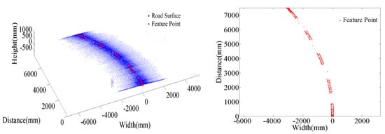 where denotes the road coordinates in the horizontal direction and represents the road height coordinates. Equations (4a) and (4b) are used for calculating the height difference and the gradient between two points, respectively. If the height difference deviates from a certain range, it implies that there is a topographic change, and the deviation of the gradient between two points from a certain range indicates a feature point of the parts showing large changes, i.e., edges. The edge points building the boundary between the asphalt and the lane can be easily obtained with this equation. In Equation (4a), d denotes the minimum height difference for a feature point, and in Equation (4b) represents the minimum angle between two points for a feature point.