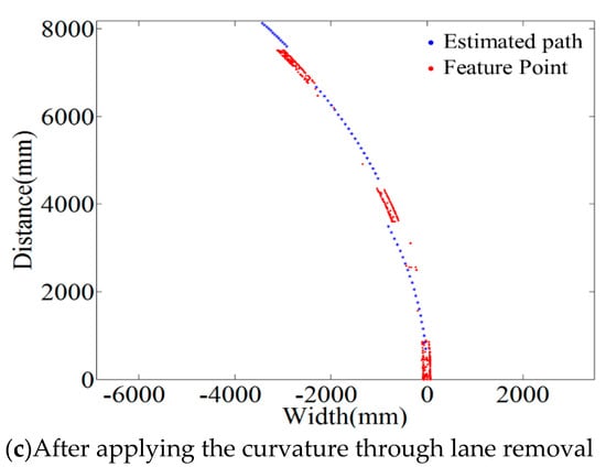 where denotes the average distance; , the average change rate of the yaw-axis angle; , the n – 1th x-axis coordinates; , the n – 1th y-axis coordinates; and , the amount of angular change between the n – 1th point and the th point. The lane tendency thus obtained can be calculated to yield the curvature radius by using Equation (16).