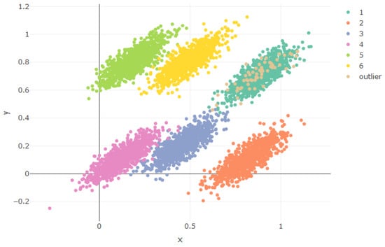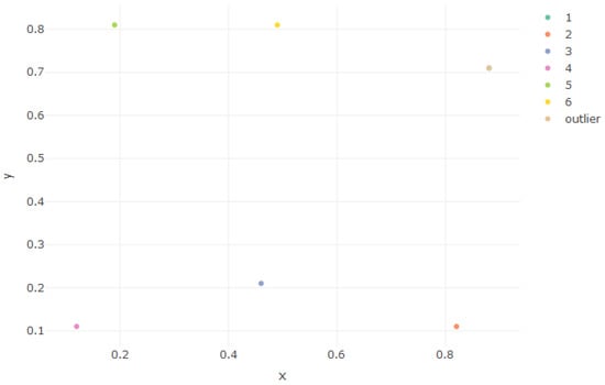 As mentioned above, the variance–covariance matrices have the same low values for the six mixture components. Since z is equal to x (except for the outlier), Equation (8) represents the covariance matrix used by all of them for the x and y coordinates.