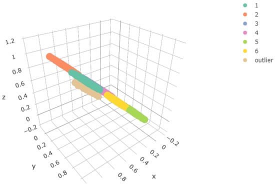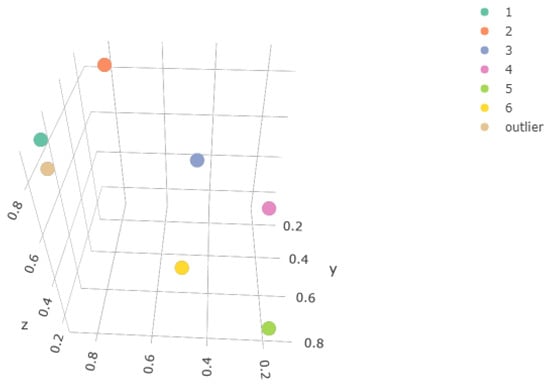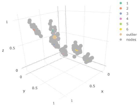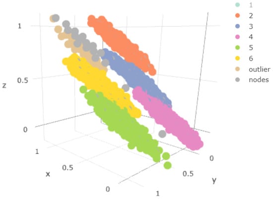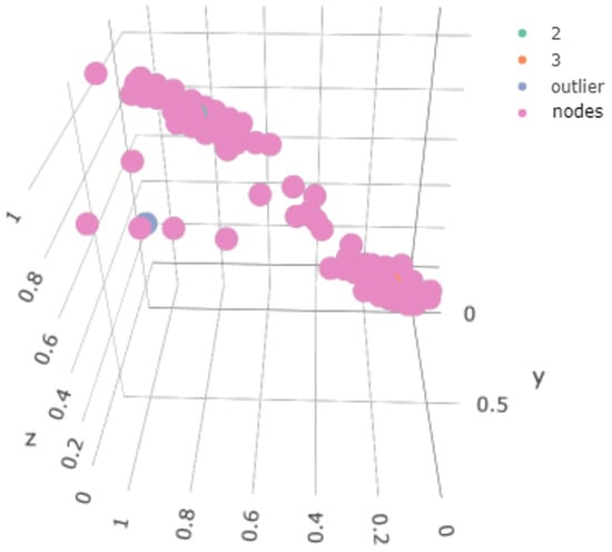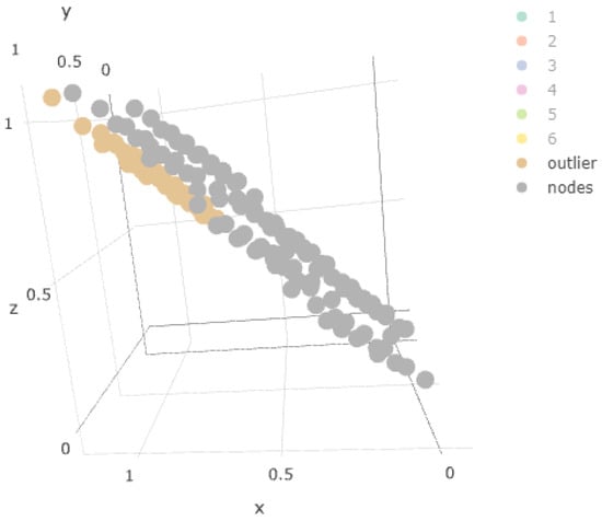 In Figure 10, we can see in three dimensions the points of the sample together with the weights of the nodes obtained (node tag), eliminating the component closest to the outliers. We validated the statement again by checking that the weights were located in the area of the component, the closest to the outlier component, but no weights corresponded to the outlier itself.