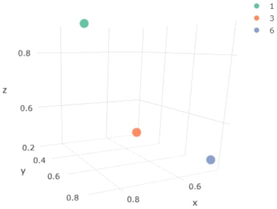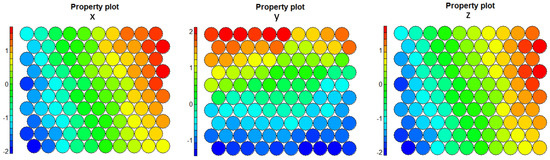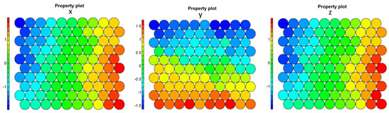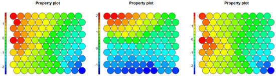 However, our outlier component, due to its proximity to one of the components included in the hyperplane , was not represented by any of the nodes Figure 8. This was also observed when comparing the original spaces’ SOM property plots, which represent each of the nodes in the map, as shown in Figure 7: The outlier values were not represented in the weights of the map nodes, as expected. This behavior is particularly striking in the z-property plot.