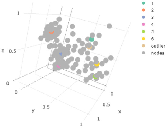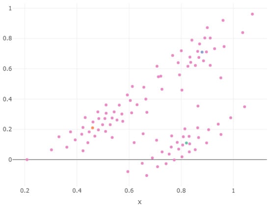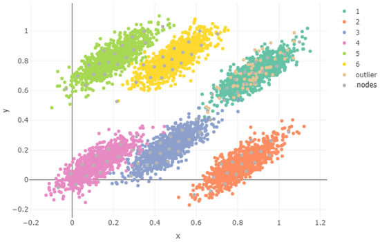 In Figure 11, we represent the variable the x and y coordinates of the population together with the x and y coordinates of the nodes obtained. We show the projection of Figure 8 onto the xy plane. It was observed that the outlier points were distributed more or less evenly along the remaining components’ points projections, which obviously did not include the z coordinate.
