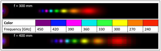 It can be noticed that, at these focal distances, the signals spaced by 30 GHz are clearly spatially separated. Moreover, radiation of higher frequency can be demultiplexed by the designed DOEs (up to 450 GHz, which corresponds to a 150 GHz shift from the DWL).