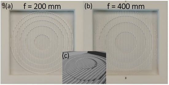 Two structures have been manufactured using Selective Laser Sintering. This method is based on sintering of a polymer in the form of powder by laser light [,] with a high vertical resolution of 0.1 mm. The structures have been manufactured from PA2200 (powder form of PA12). This material is commonly used in 3D printing and is characterized with above average optical properties in the THz spectral range [,,]. The measurements performed using the THz Time Domain Spectroscopy (THz-TDS) method have shown that PA12 is characterized by a refractive index of 1.56 (at 300 GHz) accompanied by a low absorption coefficient of 0.9 cm that corresponds to high transparency []. DOEs with focal lengths mm and mm have been selected for the experimental evaluation. The manufactured structures can be seen in Figure 4.