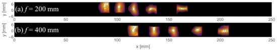 All focal spots have been scanned separately and then inscribed into the common plane. Empty points have been filled with zeros (black color). The registered intensity distributions for the DOEs with focal lengths mm and mm can be seen in Figure 6.