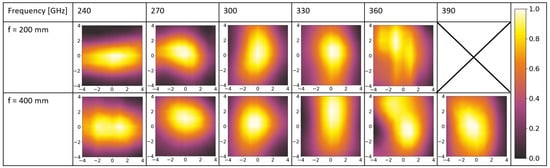 The performance of the structures has been simulated using a convolution based light propagation algorithm [] implemented in Wolfram Mathematica. It emulates the propagation of radiation by convolving the complex amplitude of the optical field with the impulse response function of the free space. For the two structures with shorter focal lengths ( mm and mm), calculations have been performed on 4096 × 4096 matrices of 0.117 µm square pixels. For the other two structures, the matrix size has been increased to 8192 × 8192 due to the higher perpendicular separation of the focal spots for longer propagation distances. Firstly, all structures have been verified for the design frequency of 300 GHz. Next, the frequency of the incoming radiation has been blue- and red-shifted with the step equal to 30 GHz. Simulated positions and dimensions of the focal spots for the two structures with shorter focal lengths are illustrated in the form of intensity distributions in Figure 2.