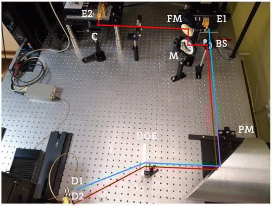 The optical setup used for verification of the spatial separation of signals with frequencies of 300 GHz and 330 GHz. E1 and E2—emitters, C—collimator, FM—focusing mirror, M—flat mirror, BS—beam splitter, PM—parabolic mirror, DOE—designed structure, D1 and D2—detector positions.