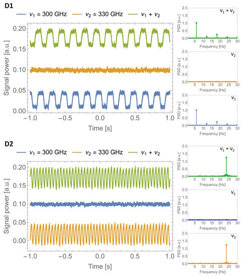 Blue and orange waveforms correspond to the and signals, respectively, and have been measured with only a single emitter turned on. The green waveform, on the other hand, has been observed with both transmitters operating. It can be seen that the broadband detector integrates both signals and the obtained waveform is a sum of both modulation frequencies. It can be observed even more clearly in the Fourier spectra of the recorded waveforms, where both modulation frequencies appear in the joined power spectral density (PSD) dependence. Higher modulation frequencies visible for the 300 GHz beam (with Hz) are a numerical artifact connected with the finite length of the transformed time domain waveform resulting in the presence of higher harmonics of the original modulation frequency .
