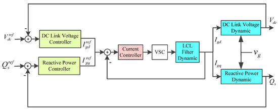 Figure 2 shows the general cascade control structure of the grid-connected inverter adopted as a base structure in this paper. As shown in Figure 2, the DC-link voltage and reactive power control loops are the outer loops in the cascade structure, and the current control loops are the inner loops. In this figure, “d” and “q” current control channels are not separated because of high coupling between the dynamic of and , as given in (6). According to (13) and (15), and can be used for control of the reactive power () and DC-link voltage, and are considered input control variables, respectively, and are assumed as input control variables for the DC-link voltage and reactive power. Higher bandwidth of the current control loops compared to those of DC-link voltage and reactive power control loops is necessary in use of this cascade control structure [33]. Thus, the establishment of the proper current control loop is the primary task in the control of a grid-connected inverter, which is discussed comprehensively in this paper. By specifying the current control loop parameters, controller design of the DC-link voltage and the reactive power is the next step for control of the grid-connected inverter.