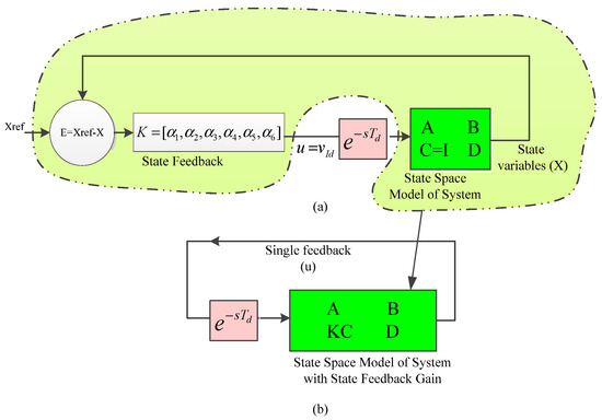 Converting a state feedback loop (a) to a single output feedback loop (b).