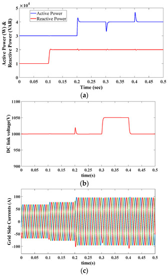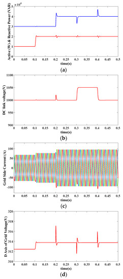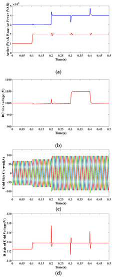Response of the simulated system with , , and ; (a) the active and the reactive powers, (b) the DC-link voltage, (c) grid-side currents, and (d) PCC voltage magnitude.
