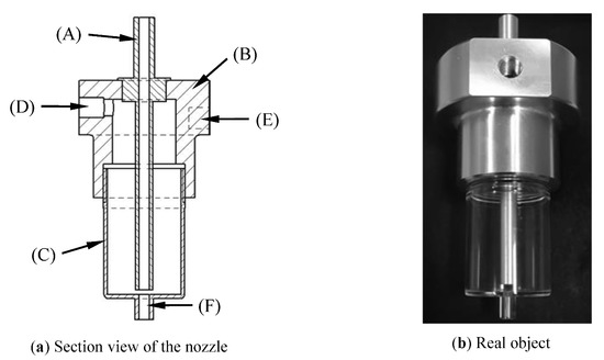 A simplified modular flow focusing/blurring nozzle was developed for the experiment. The nozzle is composed of three modules: liquid-phase delivery inner tube (A), nozzle support body (B) and two-phase mixing part (C), and its structure section view and real object are shown in Figure 1.