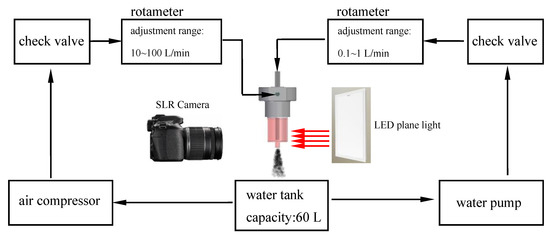 A schematic diagram of the experimental platform is shown in Figure 2. When the gas-liquid mixing inside the nozzle is studied, the properties of water and common liquid working fluids (such as gasoline) are similar. Therefore, on the basis of experimental safety and environmental protection, water and air were selected as the working fluid and atomizing gas, respectively. The liquid was injected into the nozzle from a water tank through a rotameter and check valve. The gas path is similar to the liquid path but the power source is an air compressor. The water and air flow rates were measured by rotameters and the parameters and adjustment range of the experimental equipments are labeled in Figure 2. The adjustment range of gas and liquid flow rates is determined by pre experiment. In the flow rate range selected in the Figure 2, the flow focusing/blurring experimental nozzle designed by us can work in different modes according to the needs.